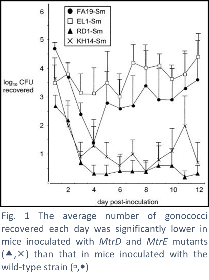 Researchers at USU and HJF have isolated the MtrE protein which naturally occurs in outer membrane of N. gonorhoeae. Studies showed that MtrD-E deficient gonococci were more rapidly cleared from mice that were capable of secreting gonadal hormones when compared to wild strains (Fig.1).